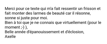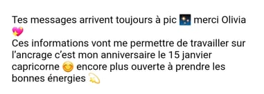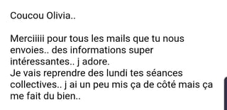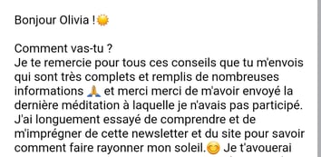 *** Marie V. : enJoylivia a donné un coup de boost à ma vie. Ca me permet des prises de conscience sur mes actions, mes pensées, mes comportements et de repartir sur de nouvelles base. Je vois comment je peux changer simplement avec beaucoup de bienveillance. Olivia est hyper disponible, elle réponds toujours aux messages et les échanges. J'adore recevoir ses mails, c'est hyper précieux !